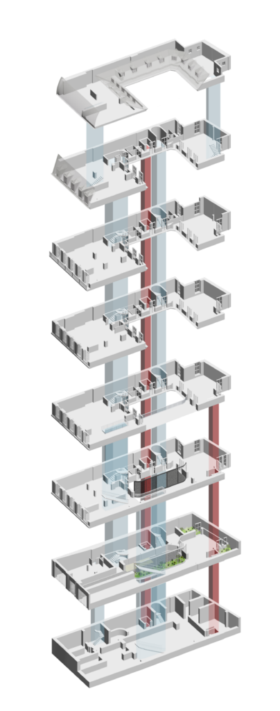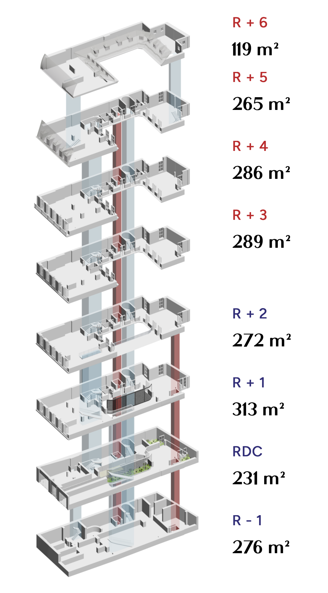 • Bureaux (du N+3 à mezzanine N+6) : 250 kg / m²